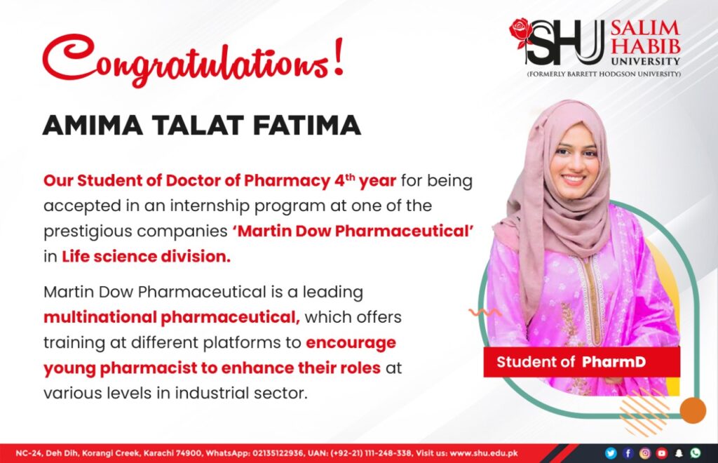 Congratulations Amima Talat Fatima, Our Student of Doctor of Pharmacy 4th year for being accepted in an internship program at