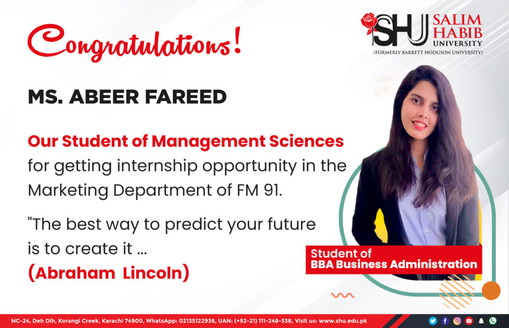 Congratulations Ms. Abeer Fareed, our student in the Management Sciences Department, for getting an internship opportunity in the Marketing Department