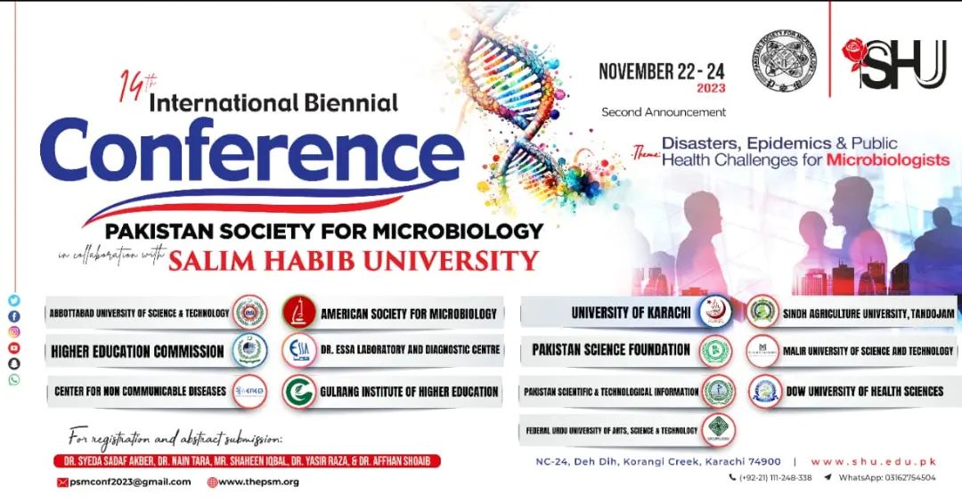 Salim Habib University, in collaboration with the Pakistan Society for Microbiology, is pleased to announce the 14th International Biennial Conference of the Pakistan Society for Microbiology (FIBC-PSM 2023) scheduled to be held from November 22 to 24, 2023, at Salim Habib University, Karachi.The conference, themed 'Disasters, Epidemics, and Public Health Challenges for Microbiologists', will include keynote sessions, workshops, and oral and poster presentations of research papers by foreign and local experts.To register for the conference or to submit your abstract, contact Dr. Syeda Sadaf Akber, Dr. Yasir Raza, or Dr. Affhan Shoaib by emailing psmconf2023@gmail.com, or visit www.thepsm.org for further details.
