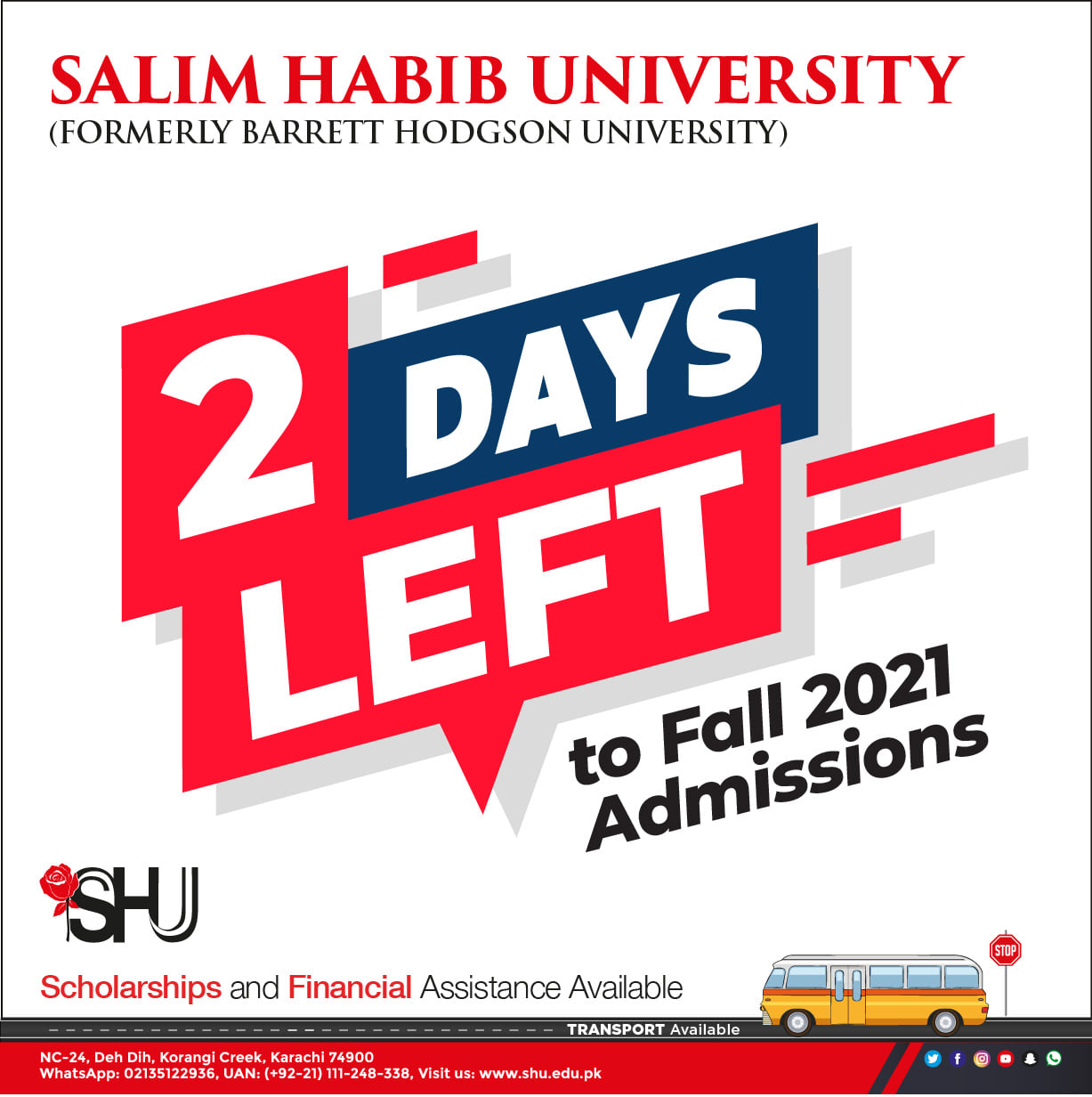 Only 2 days left to submit your Application for Fall 2021.Salim Habib University’s Admissions are Open!The Admission test for the final round is on 7th-November-2021.