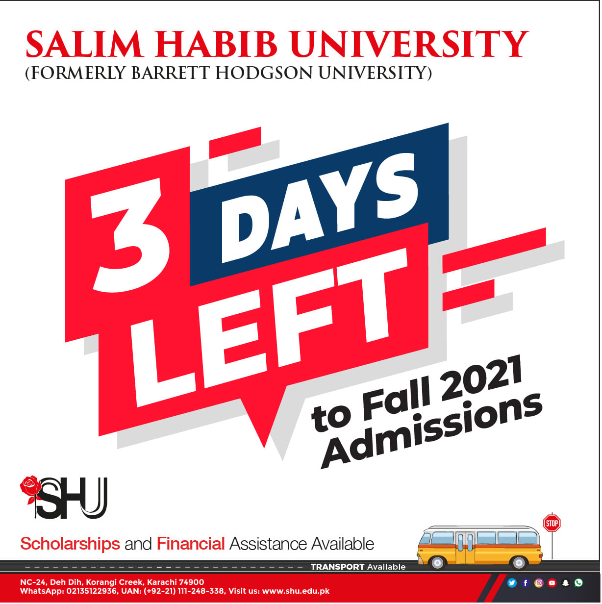 Only 3 days left to submit your Application for Fall 2021.Salim Habib University’s Admissions are Open!The Admission test for the final round is on 7th-November-2021.