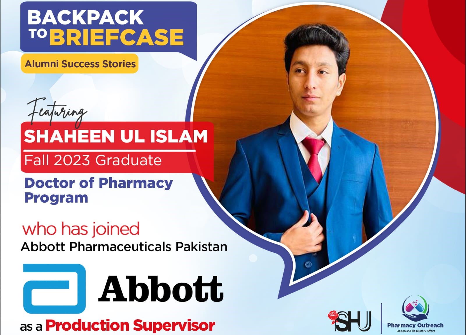 The Pharmacy Outreach, Liaison and Regulatory Affairs Office at Salim Habib University is proud to announce that Shaheen ul Islam, a Doctor of Pharmacy graduate of the Class of 2023, has secured a placement as a Production Supervisor at Abbott.This is what he has to say about his journey from campus to corporate life:"Throughout my lifetime, I have always urged myself to be the best version of myself. Luckily, as a student, I have always been granted with the best opportunities in terms of academics.I did my graduation in Pharm D from Salim Habib University. I loved being a part of this University and getting the multiple platforms it provided to me to face my fears and to explore myself and my skills.The best part of academics at SHU was exposure to the corporate world through internships in renowned pharmaceuticals and hospitals such as Scilife Pharma, NICH, General Creek Hospital and Indus Hospital. This helped me gain practical experience and bridged the gaps between studies and being on the field. Having experienced such a career-oriented environment, I was successful in securing the position of Production Supervisor at Abbott Pharmaceuticals Pakistan, which is a major success for me. Special credit goes to my mentors for grooming me and my personality in such an honourable manner, for which I will always be grateful to them."We are proud of you, Shaheen!