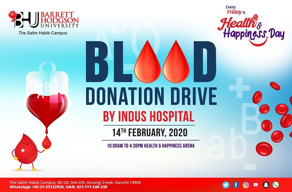 In Association with Indus Hospital, Health and Happiness Day at Barrett Hodgson University will be observed with a Blood Donation Drive.The activity will begin from 10 AM and any one who wants to volunteer can come to the Health and Happiness Arena.