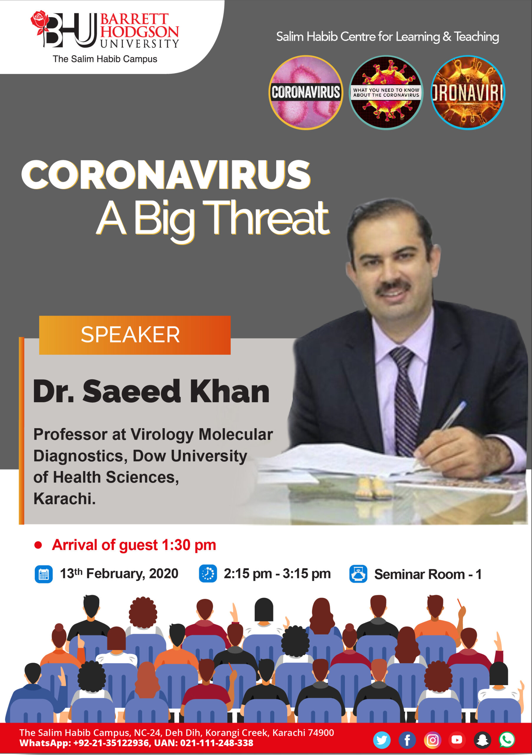 Salim Habib Centre for Learning and Teaching & Bioscience Department Barrett Hodgson University has organized a guest speaker session with Dr. Saeed Khan, Professor at Virology Molecular Diagnostics Dow University of Health Sciences. He will be presenting on the topic of ‘CORONAVIRUS – A Big Threat’ on Thursday, February 13, 2020. Timings are from 2:15 – 3.15 pm, venue Seminar Room 1