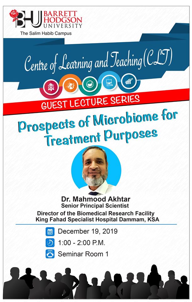 Barrett Hodgson University’s Centre of learning and Teaching is conducting a seminar with the honorable Dr. Mahmood Akhtar who received Commonwealth Scholarship to do Ph.D from University of Nottingham, UK. He has 2 postdocs; one from the University of Maryland, USA, on the ‘Pathogenicity of Helicobacter pylori’ and second from McMaster University, Ontario, Canada, which was on the ‘Role of Super Antigens and their interaction in host immune system’. He worked as Research Specialist as well as taught in Health Sciences program at McMaster University for 10 years before joining and currently working at King Fahad Specialist Hospital-Dammam as Senior Principal Scientist and Director of the Biomedical Research Facility in March 2016. He still holds an adjunct teaching position at McMaster University, guiding research students from distance. Dr. Mahmood Akhtar’s topic of presentation is “Prospects of Microbiome for Treatment Purposes”, and this session will be held on Wednesday, December 19, 2019. Time: 1 PM – 2 PMVenue: Seminar Room – 1We hope to see the Faculty, staff and students of Department of Biosciences to attend this knowledgeable session and gain deep insight of Industrial Microbiology