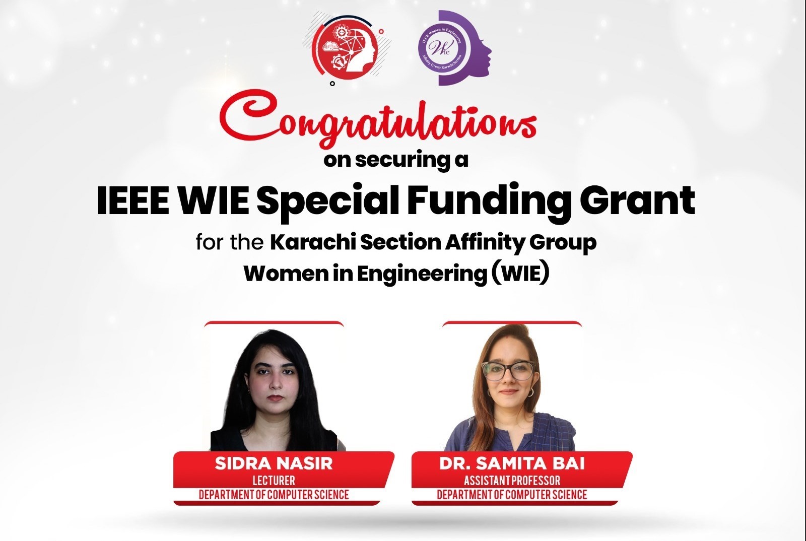 We are proud to share that Dr. Samita Bai and Ms. Sidra Nasir from the Department of Computer Science, Salim Habib University, have successfully secured a $400 grant under the IEEE WIE Special Funding for the Karachi Section Affinity Group – Women in Engineering.This grant will further empower our efforts to promote women in STEM and drive impactful initiatives within our community, and we look forward to witnessing its impact.