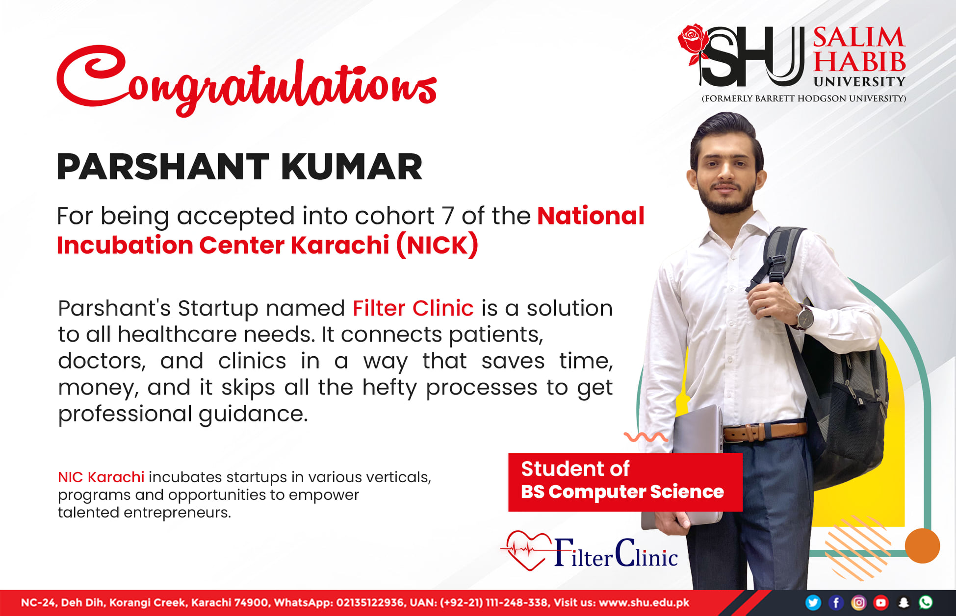 Congratulations Parshant Kumar, our student of BS Computer Science has been accepted into cohort 7 of the National Incubation Center, Karachi (NICK).FilterClinic is 1/37 Selected Startups. For 7th Cohort, NICK received 422 applications from 9 countries, 25 cities and 22 verticals.Parshant's Startup FilterClinic is a solution to people's all healthcare needs and is making them easily accessible without any limitations. It is a platform that connects patients, doctors, and clinics in a way that saves time, money, and it skips all the hefty processes to get professional guidance.National Incubation Center, Karachi incubates startups in various verticals and industries like education, health care, commerce, agriculture, finance, and robotics.The Center offers various programs and opportunities to empower talented entrepreneurs and promising startups from the Sindh region with quality incubation programs; access to mentor and investor networks; and technical resources to help create high growth and sustainable businesses.