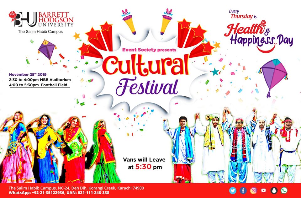 Brace yourselves! Barrett Hodgson University is bringing something exciting for you to celebrate this Thursday!Event Society presents ‘Cultural Festival’ on the upcoming Health & Happiness Day.Let us all unite to celebrate and demonstrate cultural diversities from all over Pakistan to highlight our rich traditions and heritage.