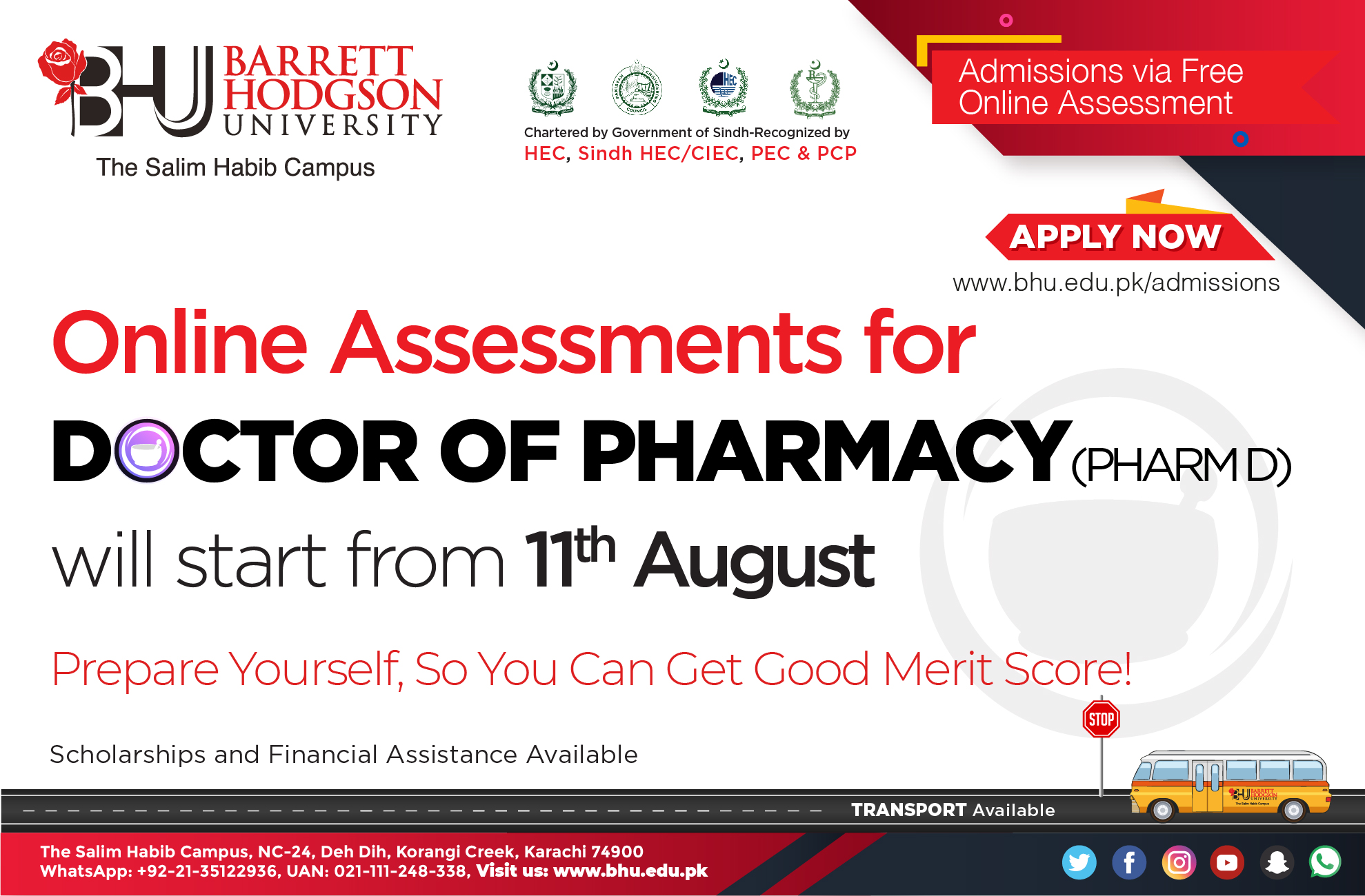 Online Assessments for Doctor of Pharmacy will start from 11th August.Prepare well to obtain a good merit score.Scholarships and financial assistance available.Apply NOW! https://www.bhu.edu.pk/Home/admissionsFor Queries WhatsApp: 02135122936#BHU #PharmD #DcotorofPharmacy #Admissions #Fall2020 #AdmissionsOPEN #SecureYourFUTURE #ApplyNow #BarrettHodgsonUniversity