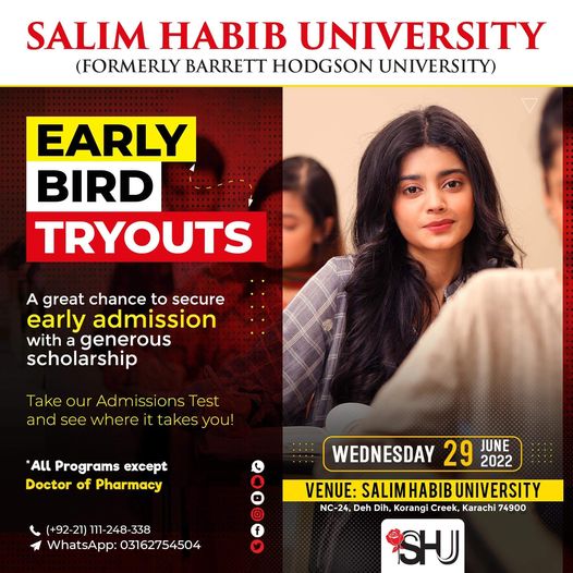 SHU announces the Early Bird Tryouts – a chance for aspiring students to take our Aptitude Test before Round 1 of Fall 2022 Admissions!The Early Bird Tryouts, being held on Wednesday, June 29, at the Salim Habib University, are a win-win situation – a passing score instantly shortlists you for admission with the opportunity to get a generous scholarship offer, while a low score still ensures that you are better prepared for Round 1.This is the quickest road to success, don't miss out on it!Apply NOW: https://www.shu.edu.pk/AdmissionsNote: Early Bird Tryouts are open for all programs except Doctor of Pharmacy