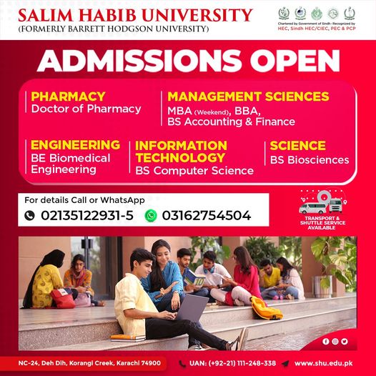 Salim Habib University's Admissions are open!We offer world-class facilities and programs with innovative curricula that enable our graduates to compete globally at any level.Apply now for a chance to secure a place in one of our exceptional programs and to get the international-standard university education you have always dreamed of.Your journey to success begins here!To apply, visit https://www.shu.edu.pk/Home/Admissions.For any queries, contact us via inbox, call us at 021-35122932-5 or WhatsApp us at 03162754504.