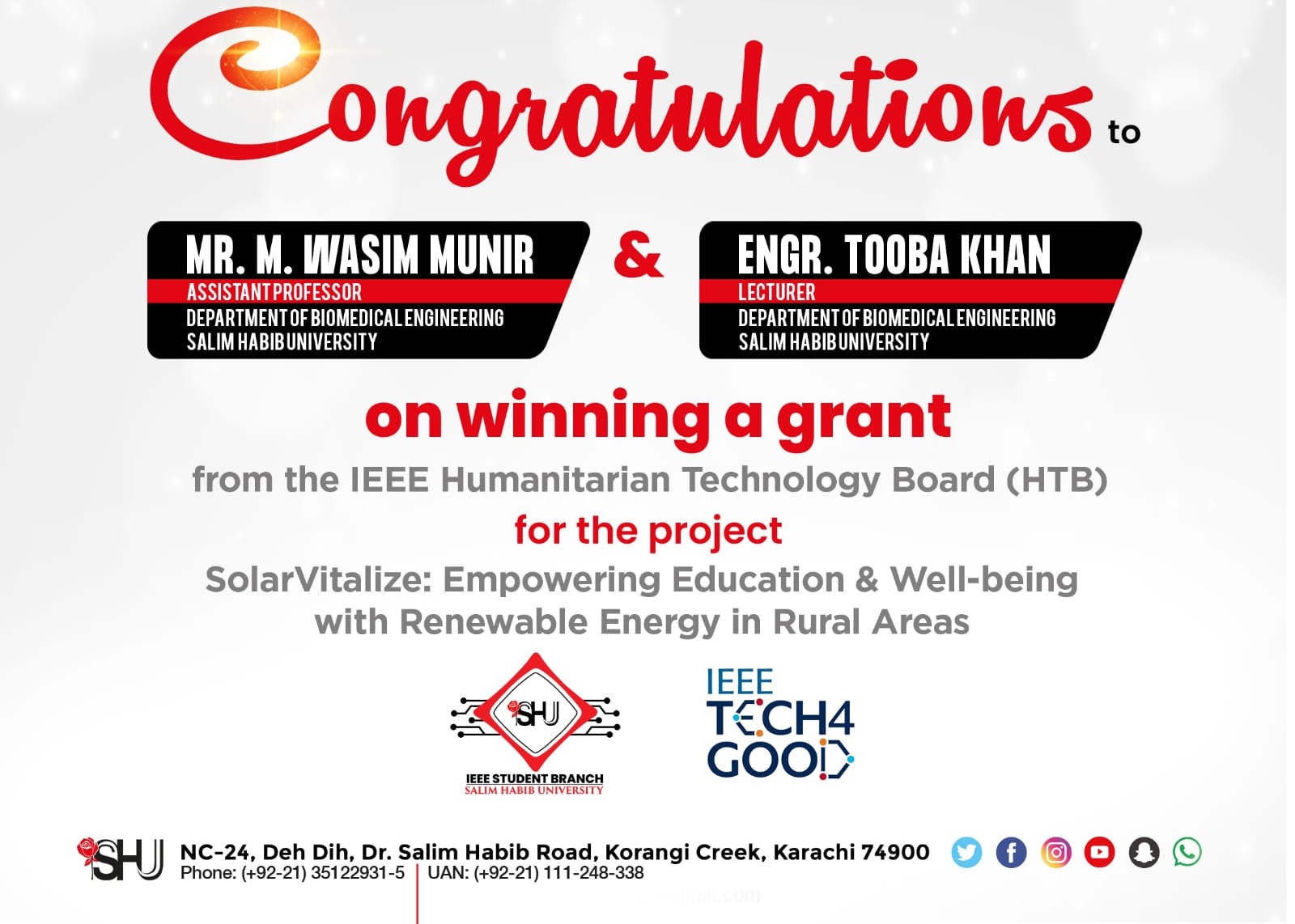 The IEEE SHU Student Branch has secured a $6,690 grant from the IEEE Humanitarian Technology Board (HTB) for their project titled 'SolarVitalize: Empowering Education & Well-being with Renewable Energy in Rural Areas.’The project, led by Mr. M. Wasim Munir, Assistant Professor, Biomedical Engineering, and Principal Investigator (PI), and Engr. Tooba Khan, Lecturer, Biomedical Engineering, and co-PI, will be implemented with the valuable contributions of IEEE SHU Student Branch members Fakhra Jalal, Amna Javed, Usama Javed, and Umer Sheikh. This initiative, supported by the IEEE Karachi Section, IEEE SHU Student Branch, and Omair Sana Welfare Foundation, supports quality education and well-being, fostering a brighter future for rural communities.