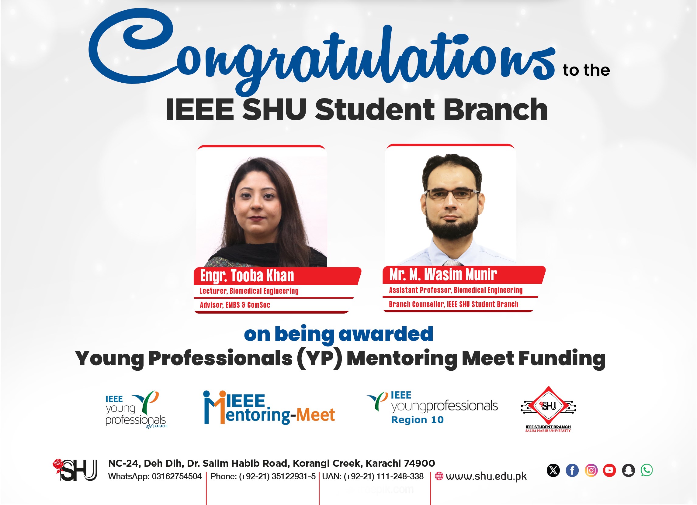 We are proud to announce that the IEEE SHU Student Branch has won a Young Professionals (YP) Mentoring Meet Fund worth USD 1000.Congratulations to Engr. Tooba Khan, Lecturer, Biomedical Engineering, and Advisor EMBS and ComSoc, Mr. M. Wasim Munir, Assistant Professor, Biomedical Engineering, and Branch Counsellor, IEEE SHU Student Branch, and the branch members whose efforts have resulted in this outstanding achievement!