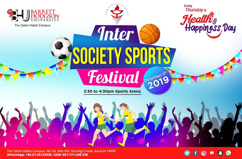 Another exciting Health & Happiness Day is coming up this Thursday at Barrett Hodgson University.Sports Society has arranged Inter Society Sports Festival on 5th Dec 2019 in Sports Arena at BHU.