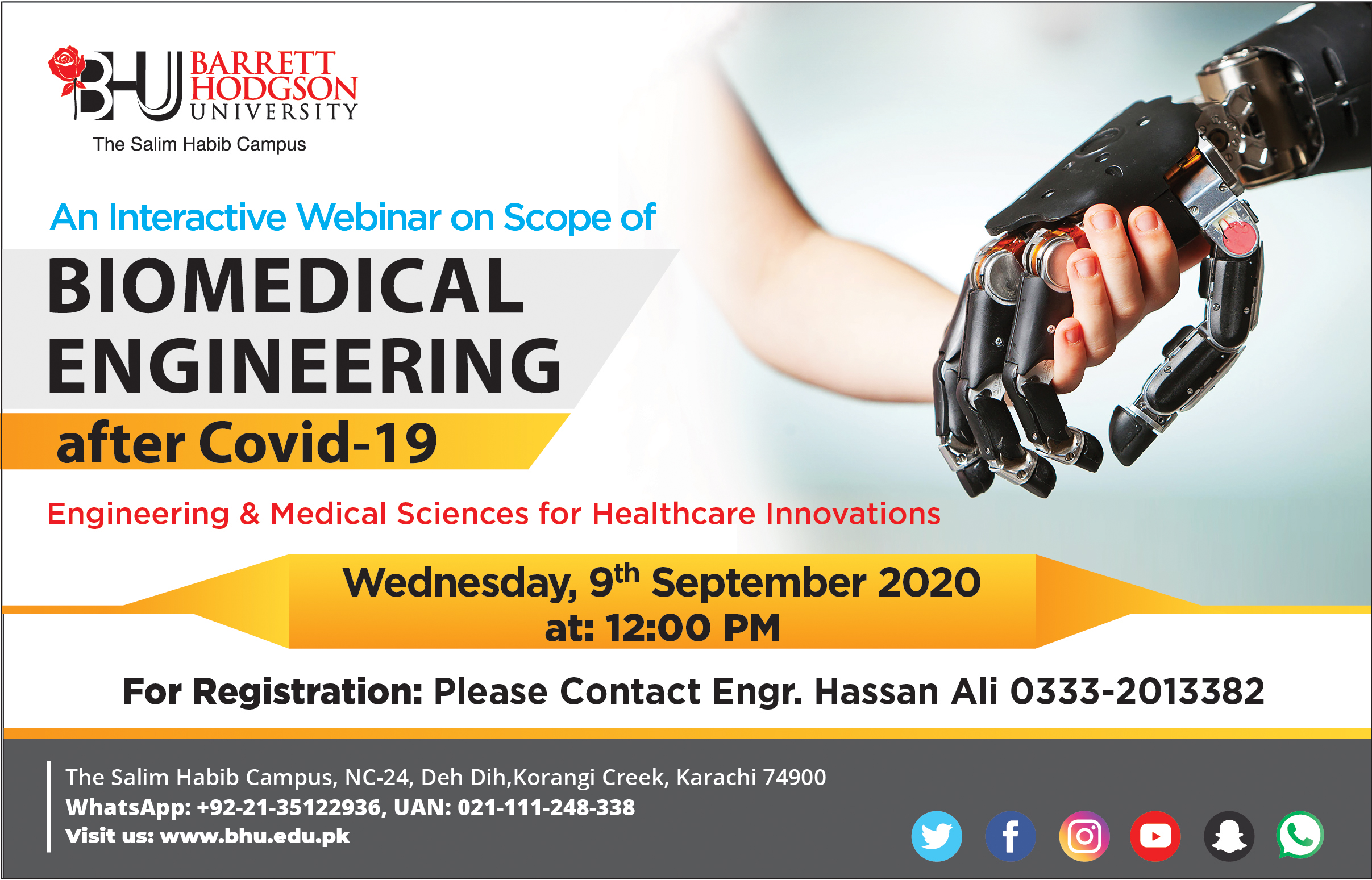 Barrett Hodgson University has arranged an Informative and Interactive Webinar on the Scope of Biomedical Engineering after COVID-19, on Wednesday 9th September 2020, at 12:00 PM.This session will be focusing on Engineering and Medical Sciences for Healthcare Innovations. For registrations click the link below or contact Engr. Hassan Ali: 0333-2013382.https://bit.ly/31Rvkbk#BHU #BME #BioMedicalEngineering #webinar #BMEScope