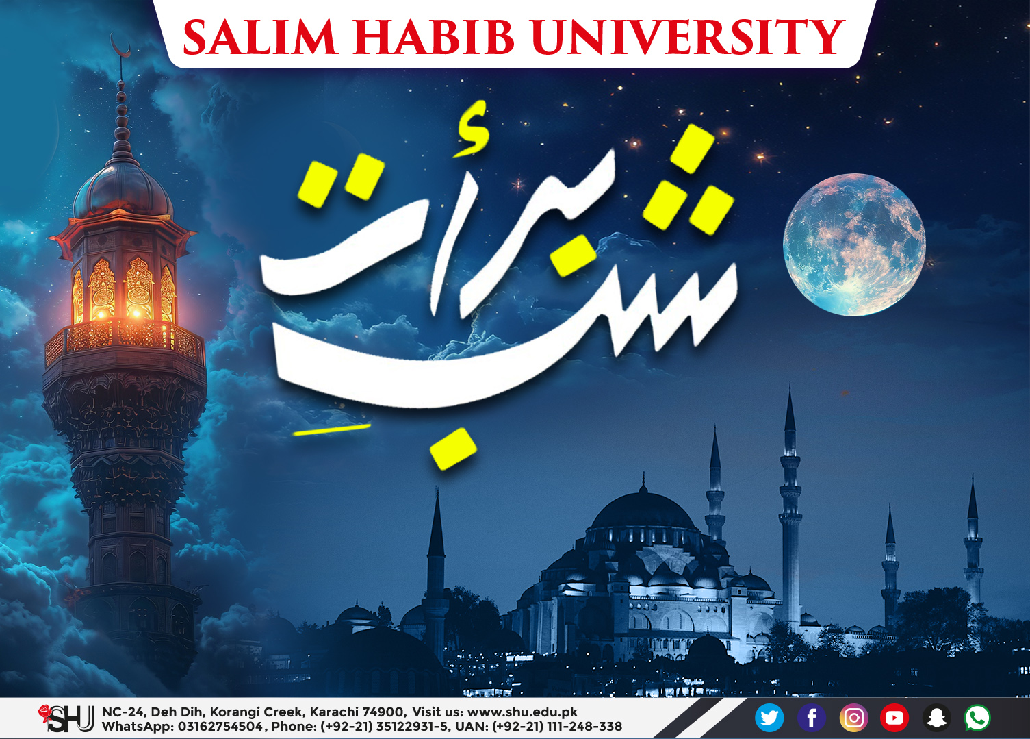 Shab-e-Barat Mubarak from Salim Habib University.On this auspicious night, we pray for forgiveness for our wrongdoings and mercy for our deceased and ill family members. May Allah bless us all and grant us health, happiness, and peace.