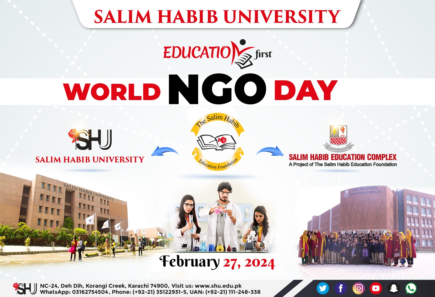 World NGO Day is held to celebrate all non-profit and non-governmental organizations that work selflessly for the betterment of humanity, and the people behind them who give their all to contribute to society every single day.Without them, their love and kindness, and their efforts to help everyone in need of help, mankind would be lost.Today, let's acknowledge the work not-for-profit organizations, such as The Salim Habib Education Foundation (TSHEF), which established Salim Habib University and the Salim Habib Education Complex (Toba Tek Singh), do in brightening the futures of countless.